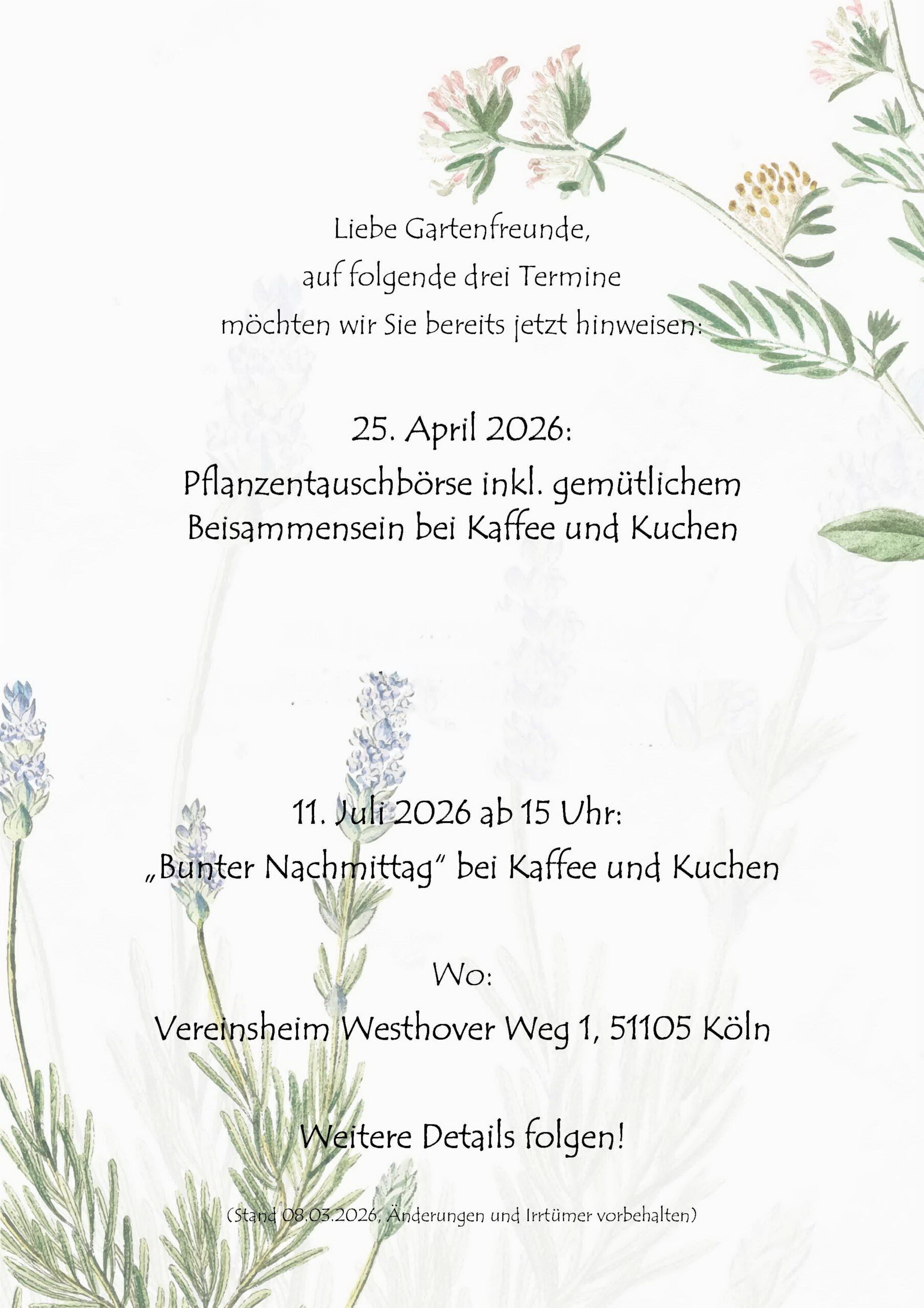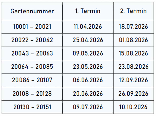 Termine Die Gemeinschaftsarbeit für die Anlagen Westhover Weg und Poller Damm kann an folgenden Samstagen jeweils zwischen 10 und 13 Uhr abgeleistet werden. An diesen Samstagen finden auch die 14-tägigen Sprechstunden des Vorstands im Büro Westhofer Weg, ebenfalls zwischen 10 und 13 Uhr, statt.